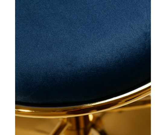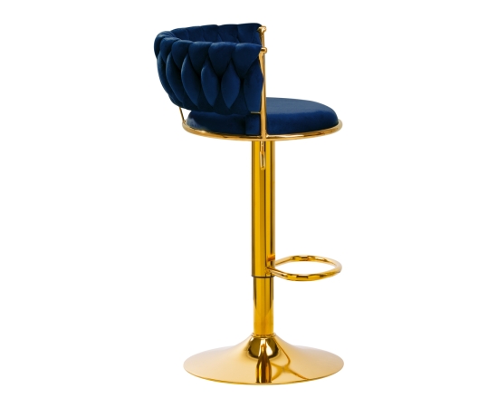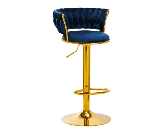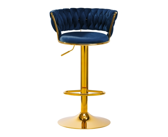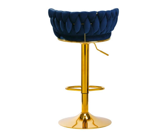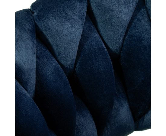 Pleasant-to-the-touch, velvet upholstery in shades of navy gives the hocker a unique character, and the aesthetically intertwined fabric on the backrest emphasizes the unique look of the furniture. The finish makes the piece of furniture catch the eye. The frame in shades of gold adds elegance and prestige, perfectly matching the velvet.