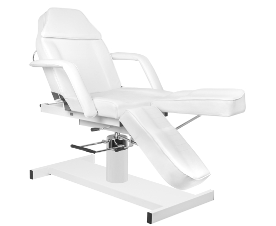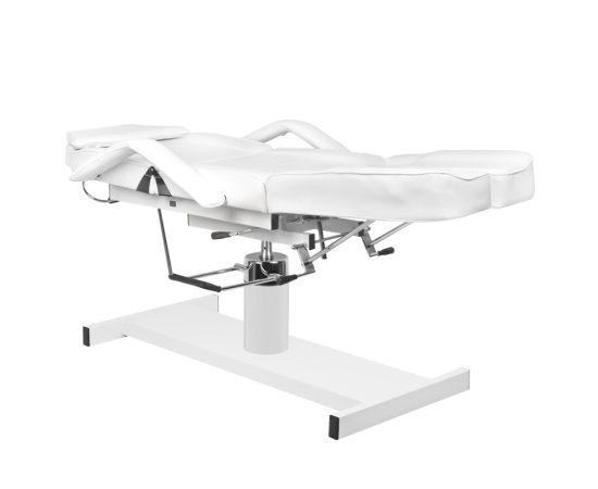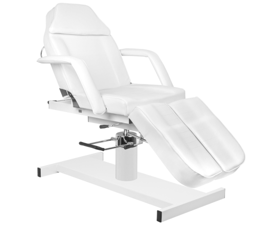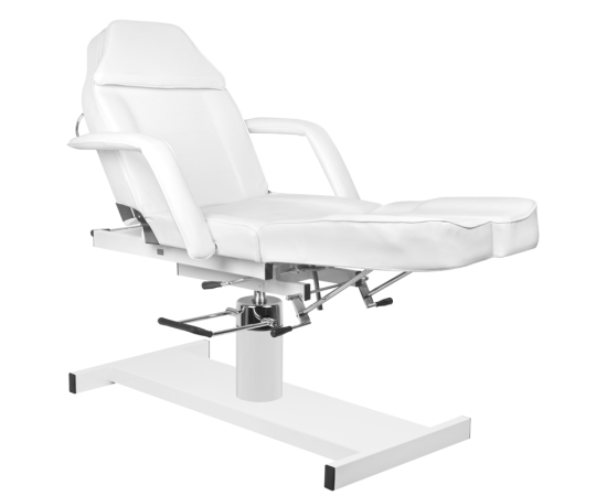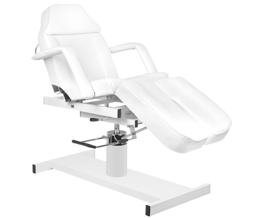 swivel chair with a lock, with divided footrests, hydraulically lifted and lowered, with a hole in the headrest, perfect for cosmetics, pedicure treatments, make-up and massage. it has removable armrests and a plug in the headrest. Easily washable seat cover, made of eco-leather, meeting the stringent EU requirements, aesthetic, nickel-plated metal elements. the armchair is available in white.