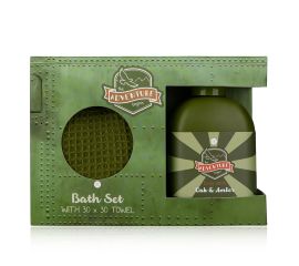 Férfi ajándék szett, tusfürdő, törülköző, Bath set ADVENTURE COLLECTION in paper gift box, 200ml body wash, 30 * 30cm towel, fragrance: Oak & Amber, col.: green/orange, kozmetikai szettek