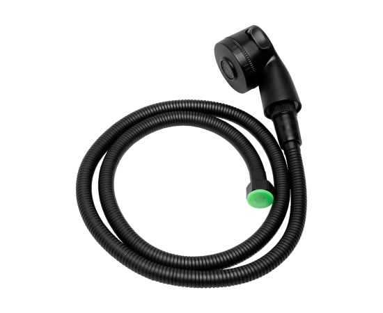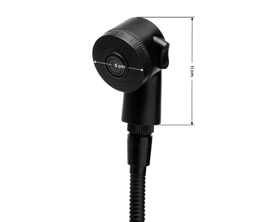 Universal shower handset in shades of black designed for hairdressing wash units. The set includes a handset with a standard bowl mounting socket and a flexible hose. This ensures quick and trouble-free installation. The product fits most wash units and mixer taps available on the market. The product is made of high-quality materials, which ensures durability and reliability. Thus, you will be able to enjoy its functionality for many years.