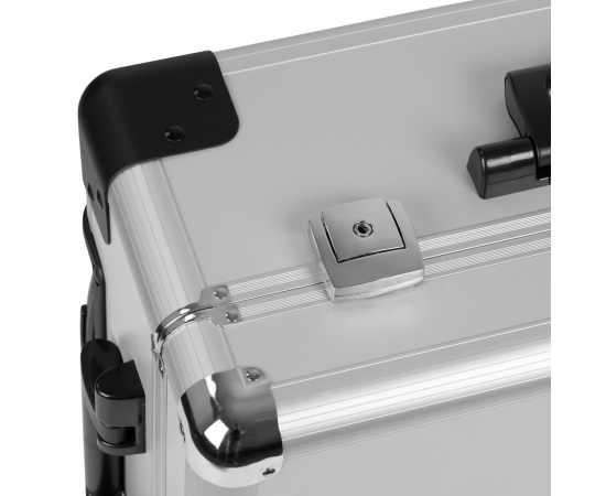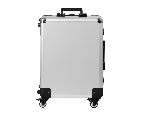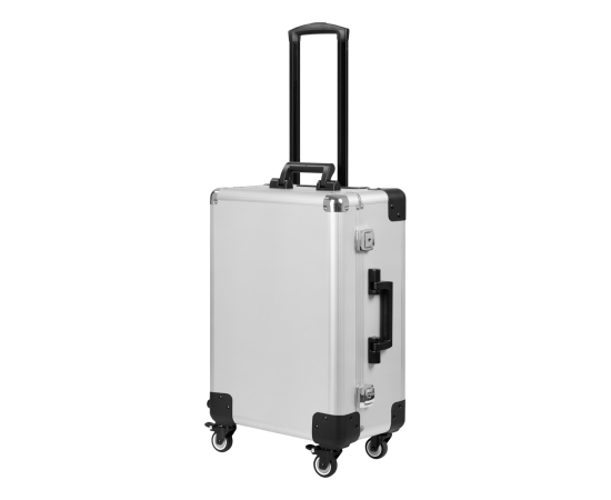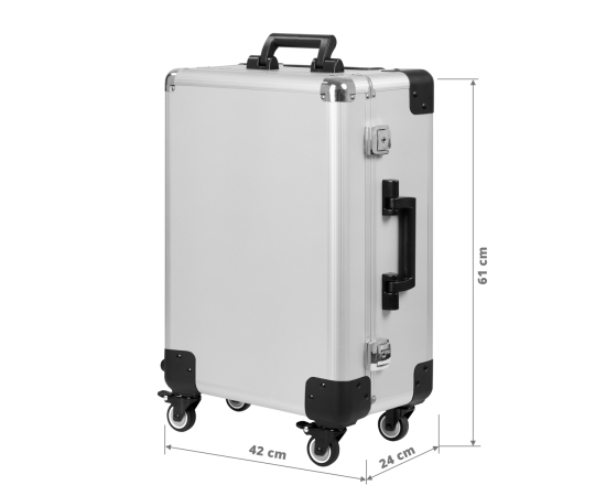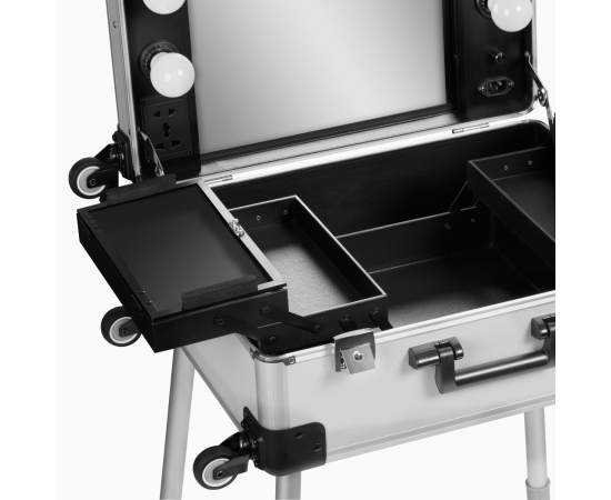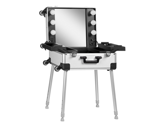 A functional cosmetic box in the form of a comfortable, portable suitcase on wheels. The perfect solution for mobile beauticians or make-up artists. Very roomy. It has four telescopic legs, thanks to which we can properly adjust the height of the station. Lighting on the sides of the mirror. Inside the trunk, there are additionally four folding shelves for small accessories. Silver colour.