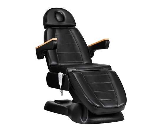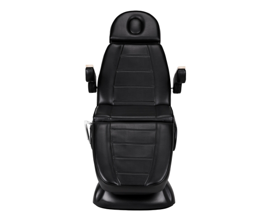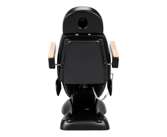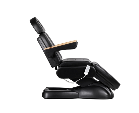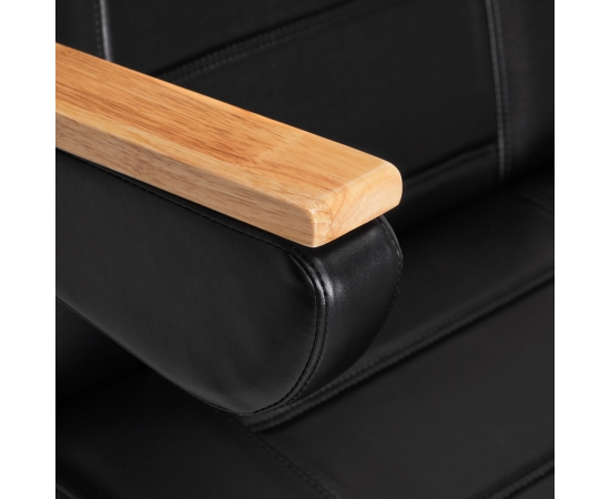 The chair is filled with foam of appropriate hardness and covered with pleasant-to-the-touch imitation leather in shades of black. Thanks to the use of a material that is easy to keep clean and resistant to selected disinfectants, the equipment is comfortable to use, resistant to moisture and easy to clean. A solid base made of durable material in shades of black ensures stability during treatments. Decorative wooden elements on the armrests distinguish the chair from other models, being a visually appealing, elegant accent. Properly profiled hems give the chair a stylish look and make the seat ergonomic.