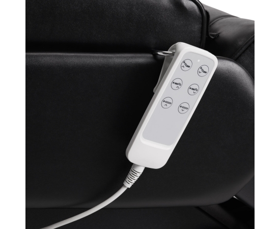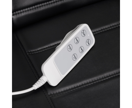 The height of the seat is adjustable from 65 cm to 84 cm, and when fully extended the chair reaches a length of over 2 meters. These dimensions allow the equipment to be easily used by people of different heights and make it adaptable to the needs of both the client and the person performing the procedure. On the right side of the seat a special metal holder for hanging the remote control has been installed, which greatly facilitates its storage and makes it always at hand.
