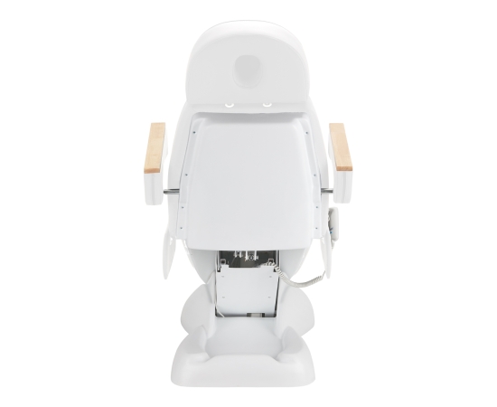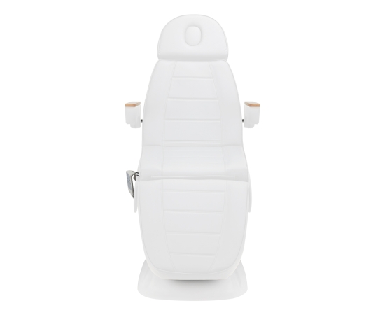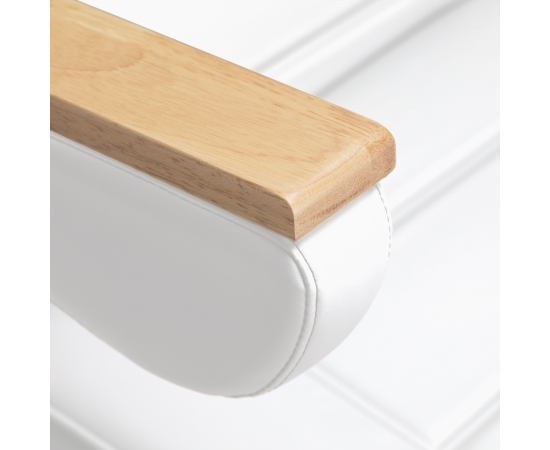The chair is filled with foam of appropriate hardness and covered with pleasant-to-the-touch imitation leather in shades of white. Thanks to the use of a material that is easy to keep clean and resistant to selected disinfectants, the equipment is comfortable to use, resistant to moisture and easy to clean. A solid base made of durable material in shades of whiteensures stability during treatments. Decorative wooden elements on the armrests distinguish the chair from other models, being a visually appealing, elegant accent. Properly profiled hems give the chair a stylish look and make the seat ergonomic.