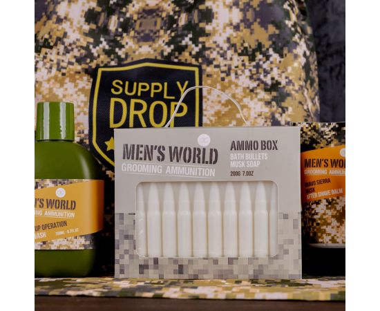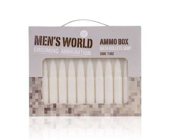 Férfi ajándék szett, Szappan, 200g soap MEN'S WORLD in paper box, ammunition shape, fragrance: Oak & Amber, col.: cream/brown/grey, kozmetikai szettek