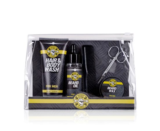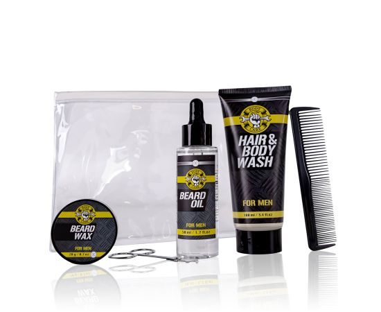 Férfi ajándék szett, tusfürdő, Szakállolaj, szakáll gyanta, szakáll olló, Bath set BATH & BODY TOOLS in PVC bag, 100ml hair & body wash, 50ml beard oil, 20g beard wax, beard scissors, hair comb, fragrance: Musk, col.: black/yellow/grey, kozmetikai szettek
