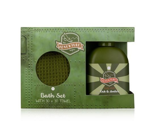 Férfi ajándék szett, tusfürdő, törülköző, Bath set ADVENTURE COLLECTION in paper gift box, 200ml body wash, 30 * 30cm towel, fragrance: Oak & Amber, col.: green/orange, kozmetikai szettek