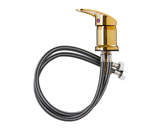 A mixer tap for use in hairdressing wash unit is an essential element of the fittings needed for efficient water connection in the hairdressing wash unit. It has two connection hoses protected with a steel braid, which guarantees increased durability and high abrasion resistance of the product. The standard gold-colored faucet is designed for installation at the bowl of a hairdressing washbasin and is compatible with most models available on the market.