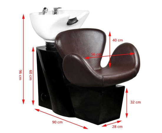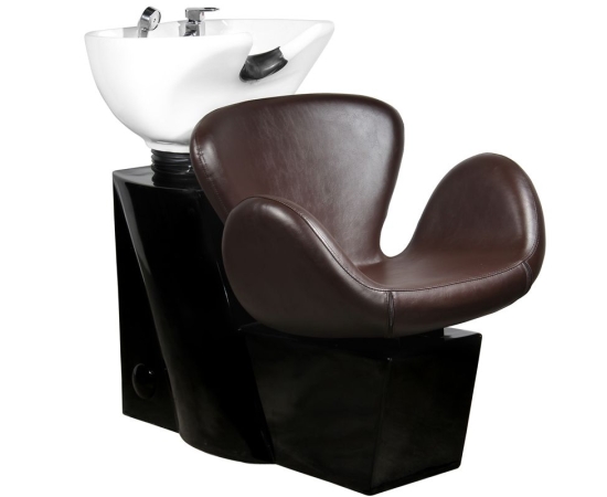 professional hairdressing car wash - stable, extremely comfortable, solidly constructed. modern design makes it a beautiful complement to the equipment of a modern hairdressing salon. a seat with a streamlined shape, made of high-quality, easy-to-care-for eco-leather. the silicone head pad stabilizes the client's head and allows it to be conveniently placed on the washer. white myki bowl, with the possibility of adjusting its inclination. black and brown car wash.