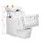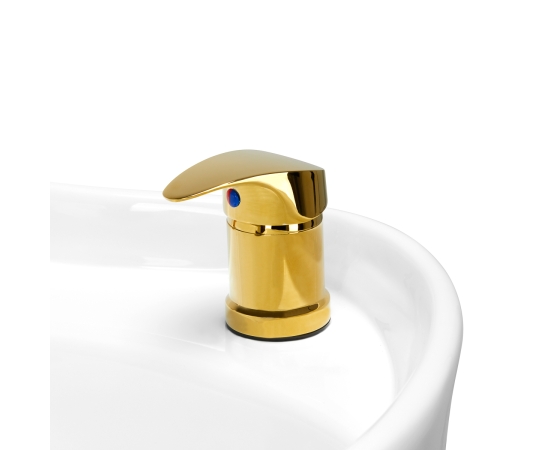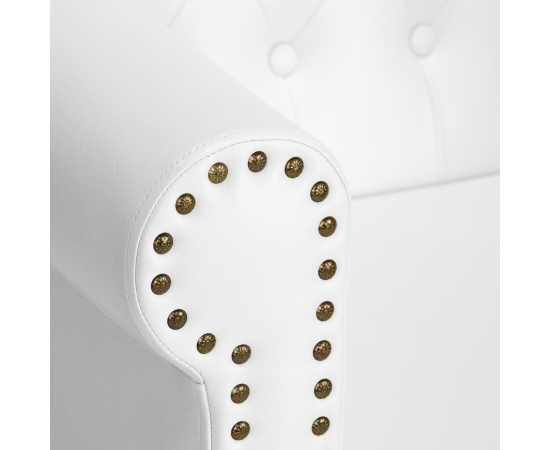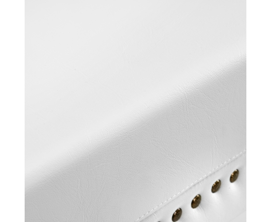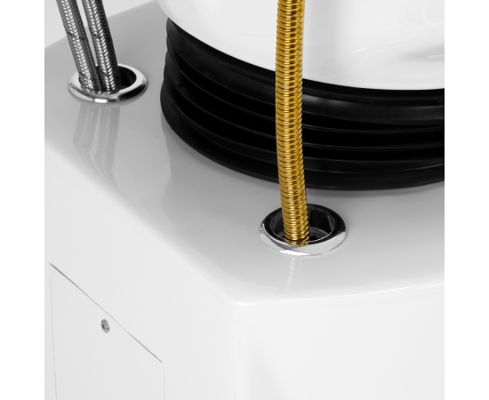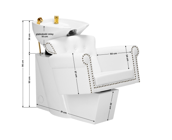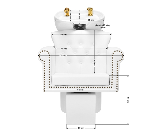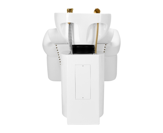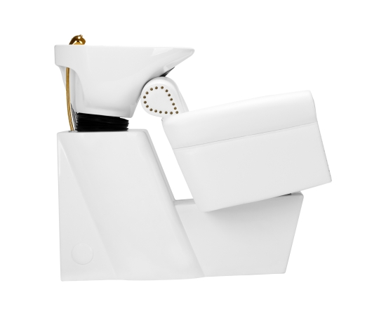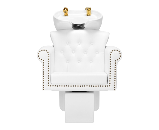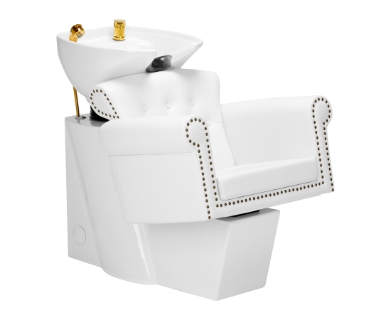A properly profiled chair filled with durable foam provides adequate support and, therefore, high comfort of use. Armrests allow for the correct positioning of the client's shoulders. Pleasant-to-the-touch synthetic leather covering in shades of white ensures long-term durability and ease of cleaning. The original, elegant design of the hairdressing wash unit with decorative quilting and golden elements gives the interior a unique expression. The set includes complete fittings in shades of gold, including a faucet, a shower handset and dedicated hoses to provide a complete set of tools for work.