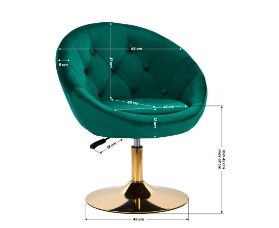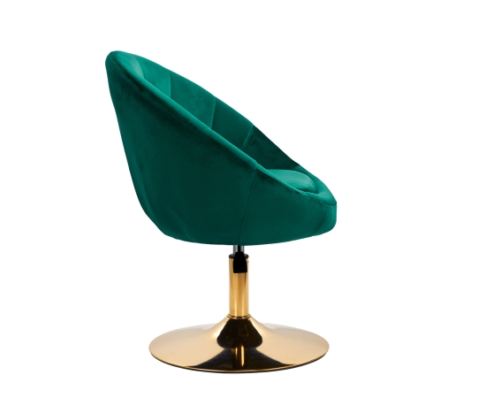 The luxurious finish makes the furniture eye-catching. The pleasant-to-the-touch, velvet upholstery in shades of green and decorative quilting give it a unique character. A stable, round base in shades of gold adds elegance, perfectly matching the velvet. Aesthetics of workmanship, comfort of use, ergonomically profiled backrest and aesthetic quilting make the chair meet the requirements of even the most demanding users.