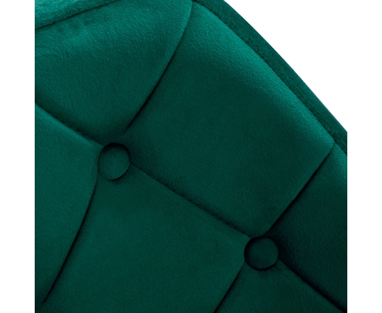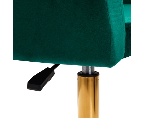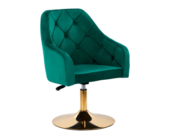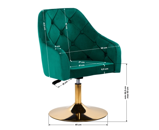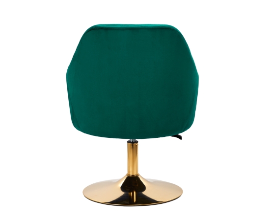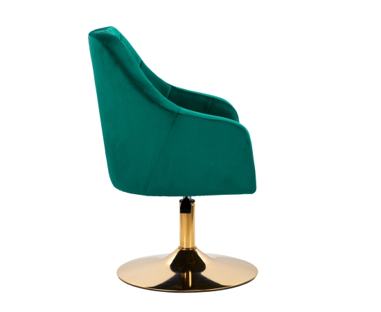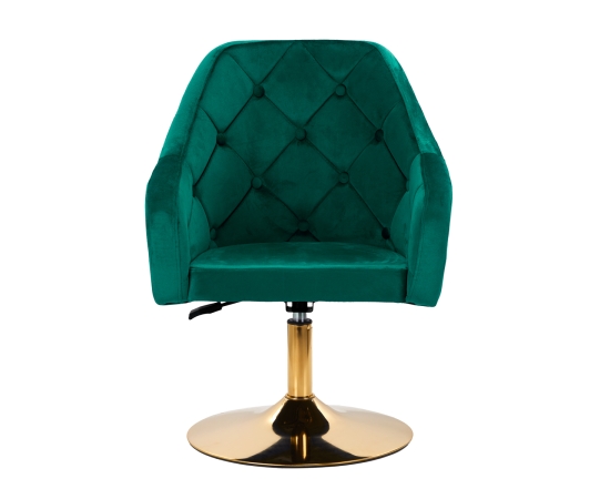 The interesting design gives the chair a unique character. The pleasant-to-the-touch, velvet upholstery in shades of green and decorative quilting make it a decoration of any interior. A stable, round base in shades of gold adds elegance, perfectly matching the velvet. Aesthetics of workmanship, comfortably placed armrests, ergonomically profiled backrest and aesthetic quilting make the chair meet the requirements of even the most demanding users.