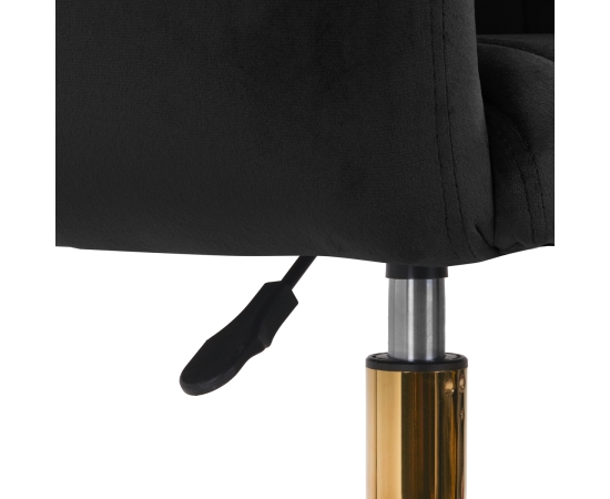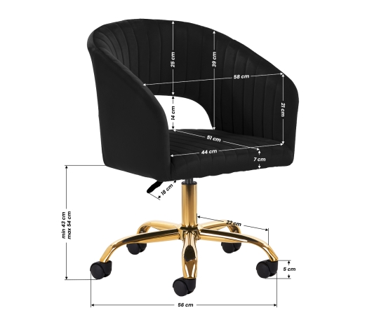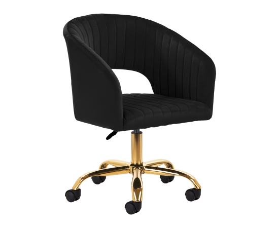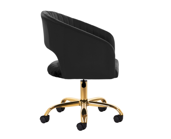 A gondos kidolgozás szemet gyönyörködtetővé teszi a bútort. A kellemes tapintású, fekete árnyalatú bársony kárpitozás egyedi karaktert kölcsönöz neki. Az aranysárga árnyalatú talp eleganciát kölcsönöz, tökéletesen passzol a bársonyhoz, a funkcionális kerekek pedig mobilitást biztosítanak, megkönnyítve a szék mozgatását a szalonban munka közben. A kidolgozottság esztétikája, a használat kényelme, a dekoratív varrások és az ergonomikusan profilált háttámla a széket a legigényesebb felhasználók igényeinek is megfelelnek.