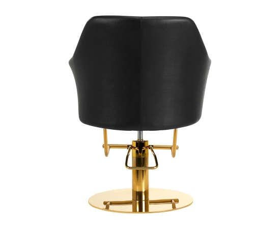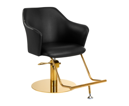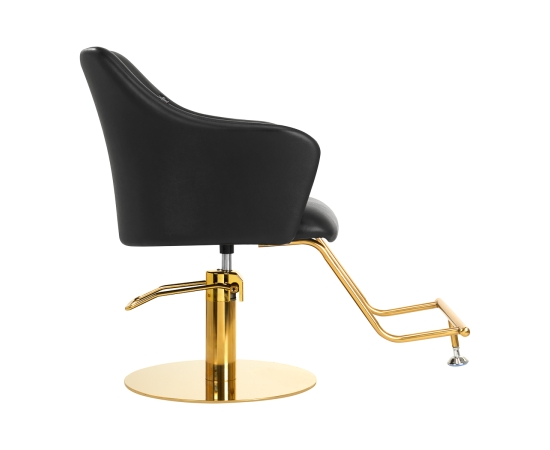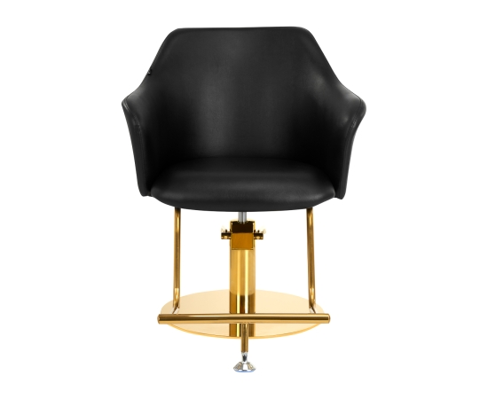 The round, solid base guarantees stability during use. The smooth surface with a mirror finish gives the element an elegant look and makes it easy to keep clean. A comfortable seat with foam filling ensures high comfort of use, even during many hours of treatments. A significant advantage is the footrest in gold tones dedicated to this model, which provides stable support for the user's feet and gives the furniture a stylish look. The armrests allow for proper positioning of the client's shoulders – this prevents them from burying their heads in their shoulders or slouching – making it much easier to perform precise treatments, such as haircuts.