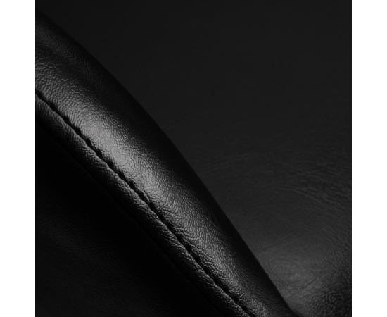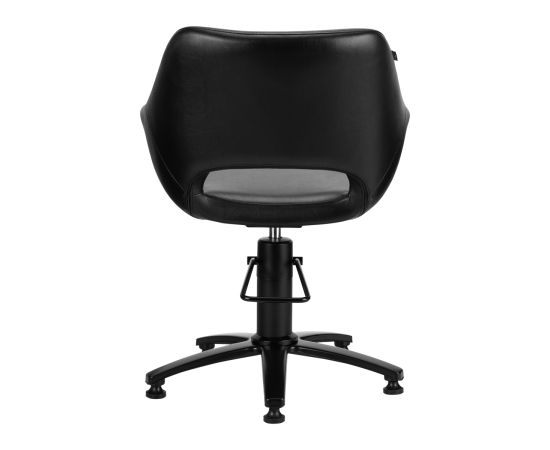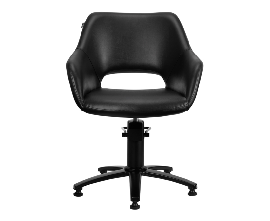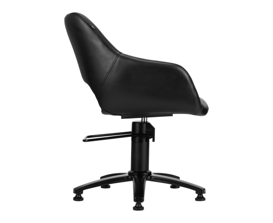 A modern black hairdressing chair. Set on a stable, five-star base. The seat is covered with high-quality eco-leather. The seat is adjustable up and down. A well-profiled seat ensures a comfortable position for the client during hairdressing treatments.
