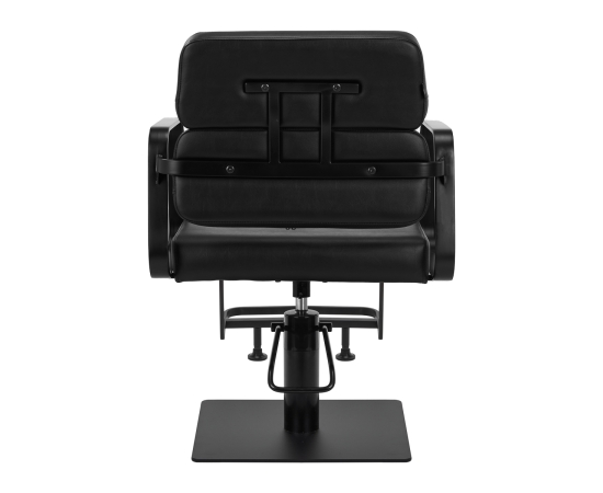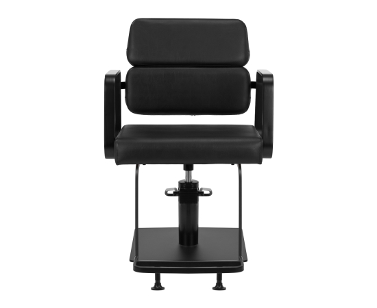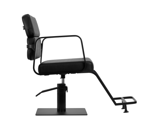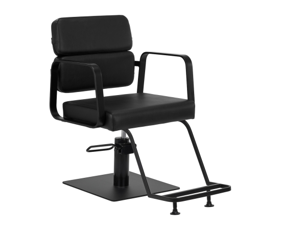 The full rotation mechanism of the chair makes the hairdresser's work more effective and comfortable. A solid, flat, square-shaped base guarantees stability during use. The matte-finished, smooth surface gives the element an elegant look and makes it easy to keep clean. A comfortable seat with foam filling ensures high comfort of use, even during many hours of treatments. Geometric, metal armrests allow for the correct positioning of the client's shoulders – this means that he does not bury his head in his shoulders or slouch – which makes it much easier to perform precise treatments, including haircuts. A stylish footrest dedicated to this model provides stable support for the user's feet.