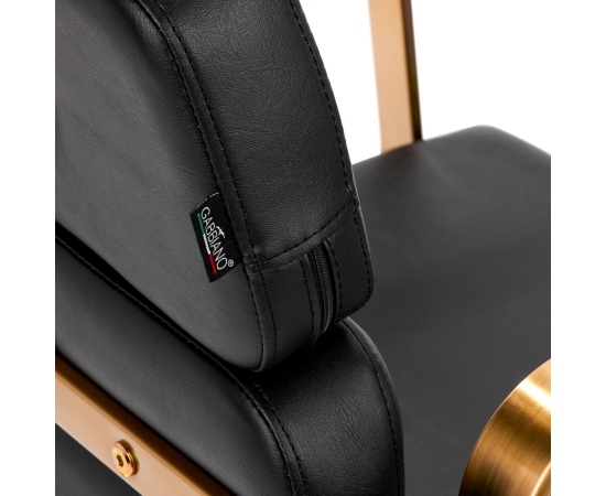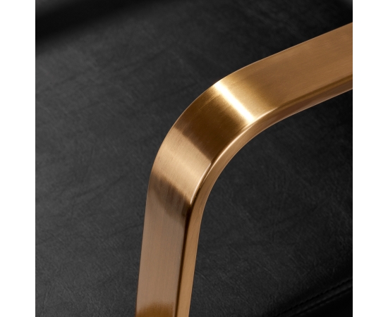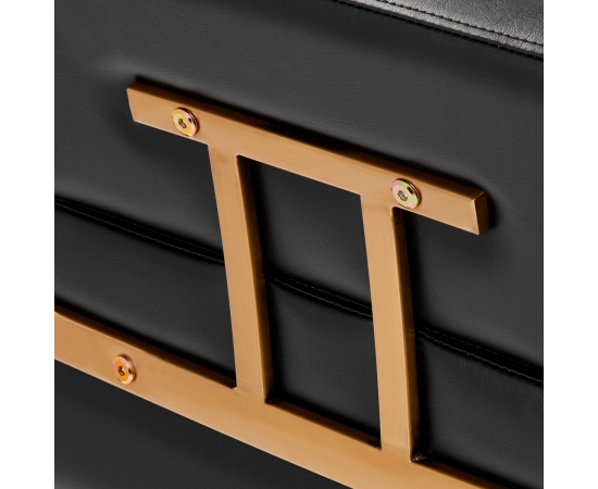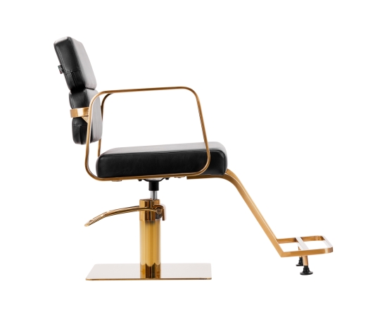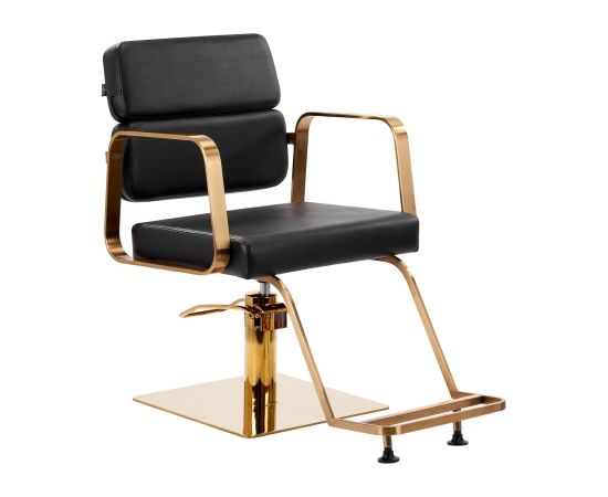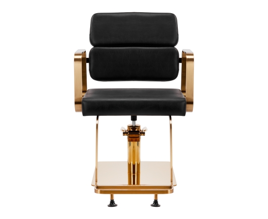 The full rotation mechanism of the chair makes the hairdresser's work more effective and comfortable. A solid, flat, square-shaped base guarantees stability during use. The matte-finished, smooth surface gives the element an elegant look and makes it easy to keep clean. A comfortable seat with foam filling ensures high comfort of use, even during many hours of treatments. Geometric, metal armrests in shades of gold allow for the correct positioning of the client's shoulders – this means that he does not bury his head in his shoulders or slouch – which makes it much easier to perform precise treatments, including haircuts. A stylish footrest dedicated to this model provides stable support for the user's feet.