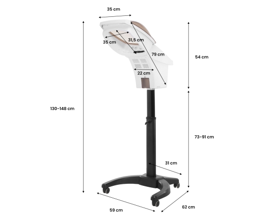 The Gabbiano 408D standing hairdressing sauna is an innovative device for deep moisturizing, rebuilding and nourishing hair. The steam generated by the device causes the hair cuticles to expand, which facilitates more accurate absorption of substances contained in various types of hairdressing preparations. The active ozone supports hair cleansing, eliminates the smell of chemical products used during hairdressing treatments and improves blood circulation in the scalp.