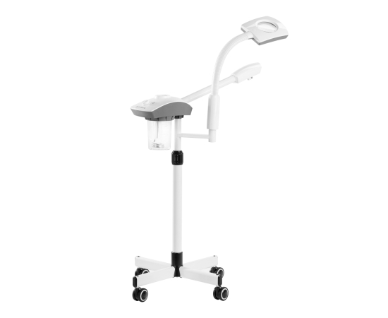 The vaposon is made of plastic in shades of white, which makes the device easy to keep clean. The stand is equipped with an easy height adjustment in the range of 78-95 cm, allowing the equipment to be positioned at the appropriate level to ensure the comfort of work for the person performing the treatment. Both the magnifier lamp and the steamer nozzle can be rotated independently, which increases the range of possible settings. The four-arm base with rubberised wheels improves mobility, making it easier to move the device around freely.