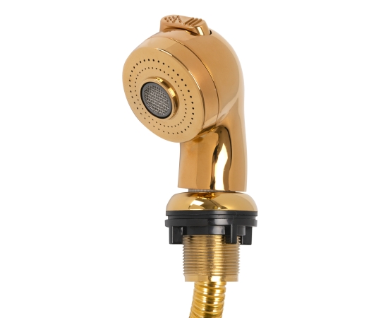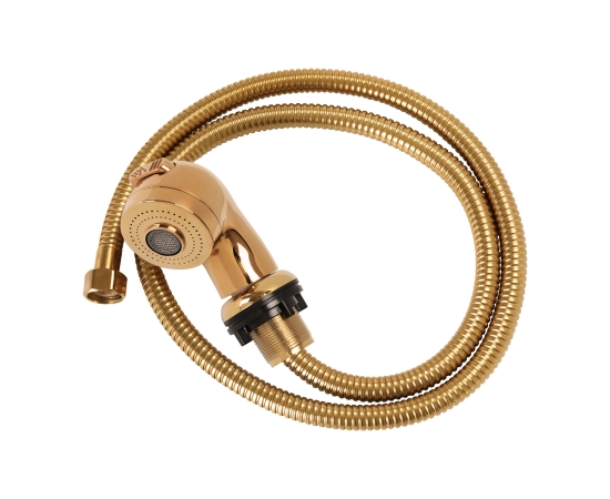 An elegant shower head in shades of gold for use in hairdressing wash units. The set includes a shower head with a standard bowl mounting socket and a flexible hose. This ensures quick and trouble-free installation. The product fits most wash units and mixer taps available on the market. The product is made of high-quality materials, which ensures long-term durability and reliability. Thus, you will be able to enjoy its functionality for many years.