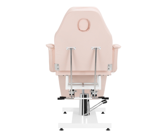 The height of the seat can be adjusted in the range of 65-79 cm hands-free using a hydraulic pump. This allows for comfortable use of the equipment for people of different heights and allows it to be adapted to the individual needs of both the client and the person performing the procedure. The mechanism used is very durable and reliable. Thanks to the hole in the headrest hidden under a properly profiled cushion, the chair will also be perfect for treatments carried out on the back, such as massages or tattoos.