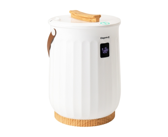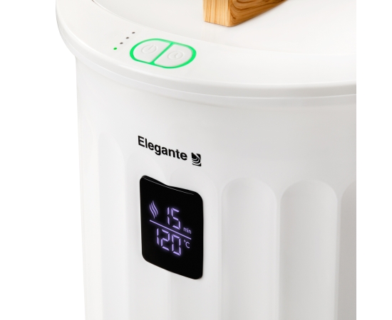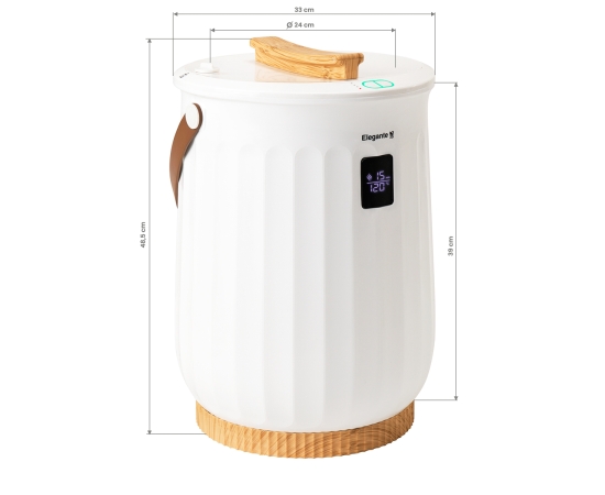 The Elegante E18 towel warmer provides the ability to heat two large towels at one time. Thanks to its unique bucket-shaped design, the device ensures even heat distribution over the entire surface during each use. For greater comfort of use, it is equipped with a display, a carrying strap and a scent disc holder.