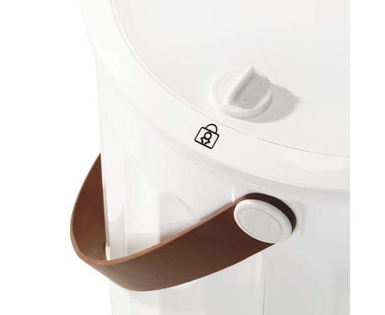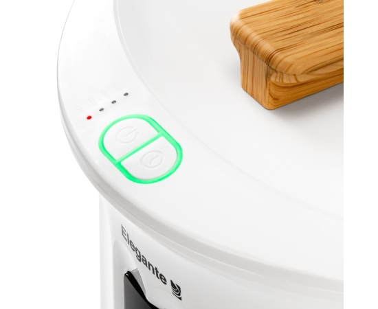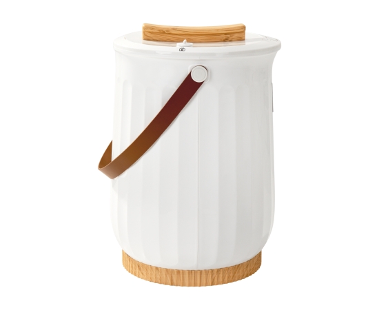The casing of the heater is made of plastic in shades of white, which makes it easy to clean. Aesthetic grooves and decorative elements imitating wood are a visually pleasing addition. The signaling LED light around the buttons informs about the working status of the heater, while the control diode informs about the selected operation time. The free-standing device is convenient to carry – which is facilitated by a special durable strap – and to store, and the stylish, round base saves space.