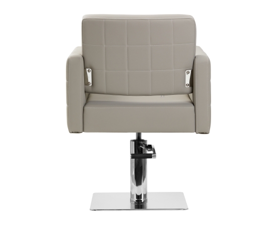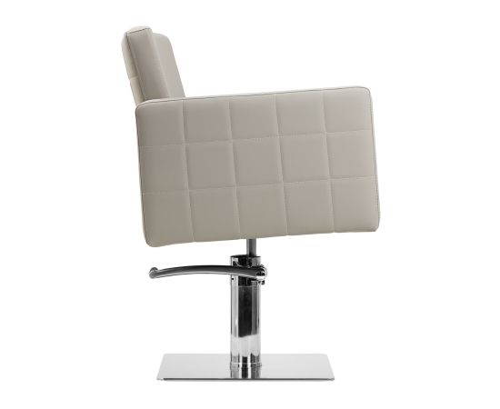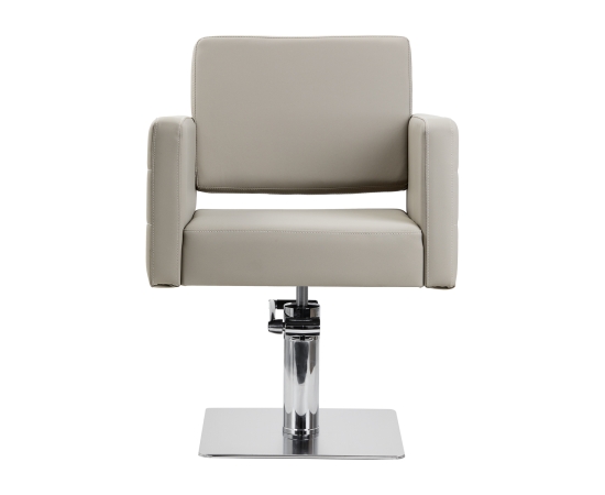 A solid, flat, square base ensures stability during use. The smooth surface with a mirror finish gives the element an elegant look and makes it easy to keep clean. A comfortable seat filled with durable foam ensures high comfort of use, even during many hours of treatments. Upholstered with synthetic leather with decorative stitching armrests are a visually interesting element, and more importantly, they allow the customer's shoulders to be positioned correctly. This means that he does not bury his head in his shoulders or slouch – this clearly makes it easier to perform precise procedures, including haircuts. Equipping the chair with a full rotation mechanism makes the hairdresser's work more effective and comfortable.