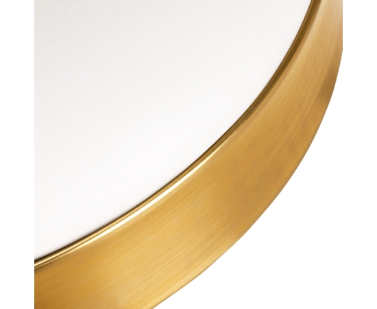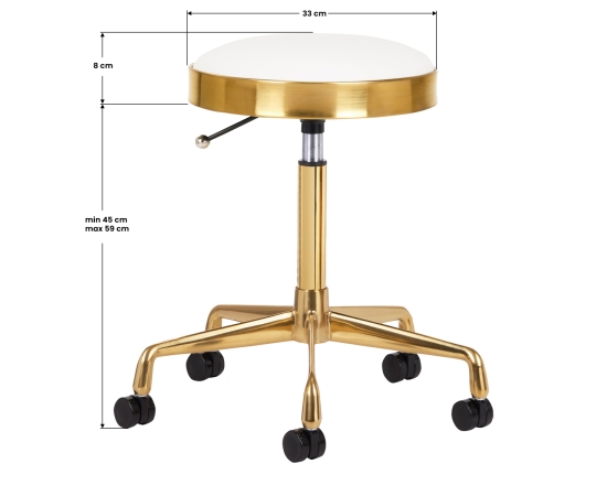 This golden stool has a comfortable white seat covered with ecological leather. It is supported by a stable five-leg base. Made of metal alloys, it is durable and resistant to damage. The seat height is efficiently regulated. Plastic wheels allow you to easily change the position. The seat is fully rotatable.