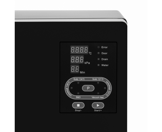 It is a compact device that combines the 12-liter autoclave with a built-in thermal printer. It has a LED display and USB port, which allows you to connect a flash drive to save the results of the cycle. It has 6 fully automatic programs; 4 sterilization programs and 2 test programs. The shortest sterilization program takes only 8 minutes including drying. The device has a built-in tank for clean (distilled) water for sterilization, and a tank for used water with the possibility of drainage at the front of the device. Self-diagnosis system will effectively protect against damage and preserve the durability of the device. Additional security is provided by the double door lock system.
