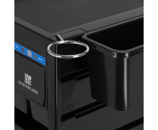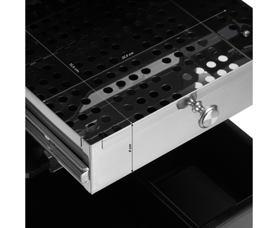 The UV-C sterilizer installed in the helper is an excellent solution that will ensure the safety of the treatments performed. It will easily and quickly clean the surfaces of tools from most pathogens. The interior of the device is made of surgical steel and is mirrored, which reflects UV rays and ensures more thorough disinfection. An efficient quartz lamp with a wavelength of 254 nm effectively destroys various forms of microorganisms. The suggested duration of the process is 10 minutes, but you can freely adjust this value within 5-30 minutes, which are counted down by the digital display.