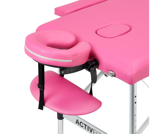 The Activ Fizjo Komfort folding aluminum massage table is a two-segment model with upholstery in shades of pink, which is perfect for a massage parlour or physiotherapist, as well as many other specialist practices. The product does not take up much space, and with the possibility of easy and quick assembly, the relative lightness of the structure and the matching bag included in the set, it is also a great choice for mobile services.