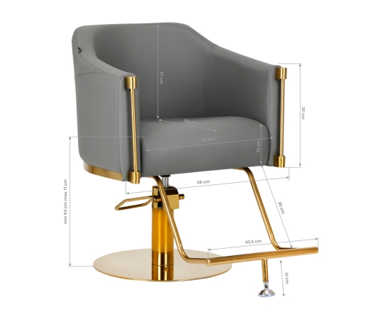 A durable hydraulic lift allows the height to be adjusted within 54-71 cm, even when the customer is sitting on the chair. This guarantees more ergonomic work, thanks to the ability to adjust the seat level to suit the height of both the client and the hairdresser. The properly profiled, rounded backrest allows to take a comfortable position, which is important especially for treatments lasting many hours. A significant plus is a chic footrest matched to this model, which provides stable support for the user's feet.