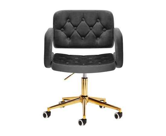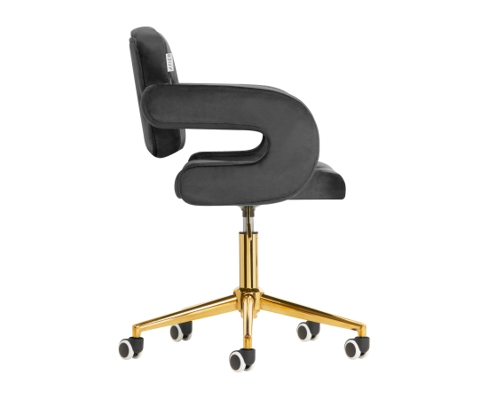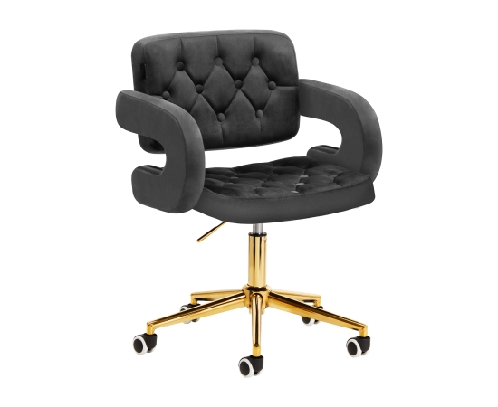 Pleasant to the touch, velvet upholstery in shades of gray gives the furniture a unique character. The finish makes the furniture eye-catching. The frame in shades of gold adds elegance, perfectly matching the velvet. Functional wheels ensure mobility, making it easier to move the chair and move around the salon while working. Aesthetics of workmanship, comfort of use, decorative quilting and ergonomically profiled backrest make the chair meet the requirements of even the most demanding users.