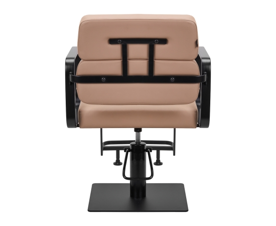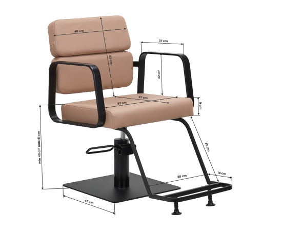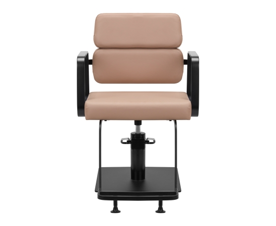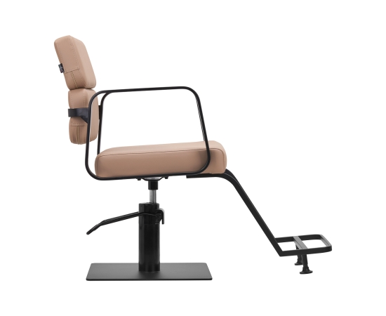 The full rotation mechanism of the chair makes the hairdresser's work more effective and comfortable. A solid, flat, square-shaped base guarantees stability during use. The matte-finished, smooth surface gives the element an elegant look and makes it easy to keep clean. A comfortable seat with foam filling ensures high comfort of use, even during many hours of treatments. Geometric, metal armrests allow for the correct positioning of the client's shoulders – this means that he does not bury his head in his shoulders or slouch – which makes it much easier to perform precise treatments, including haircuts. A stylish footrest dedicated to this model provides stable support for the user's feet.