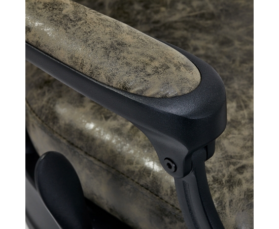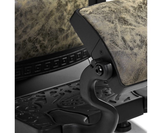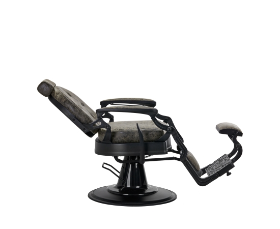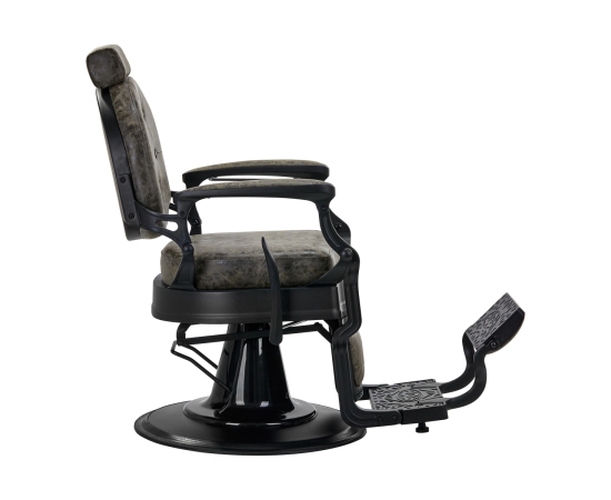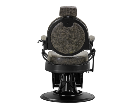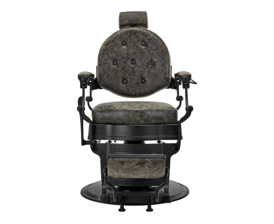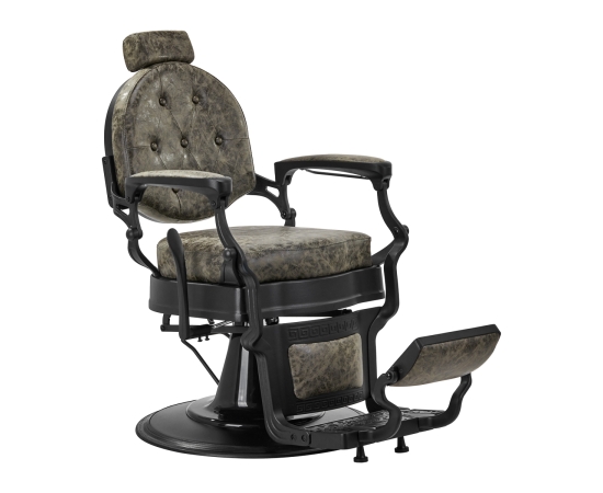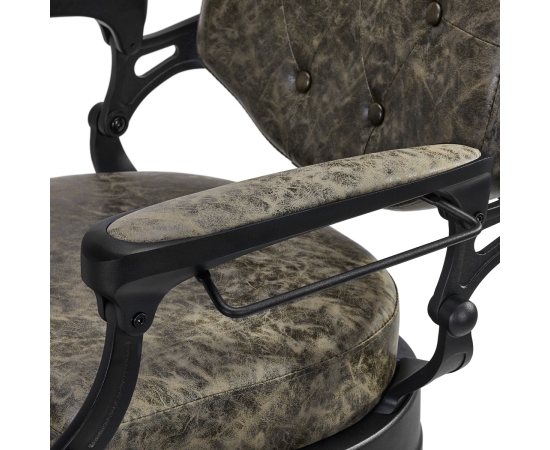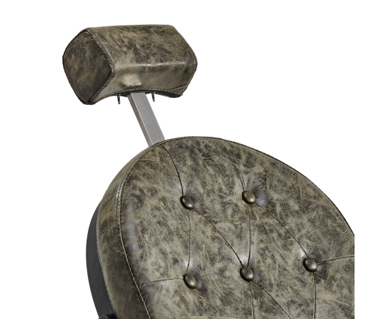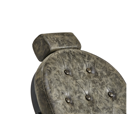 The solid construction of the base ensures stability and high comfort of use. The seat filling is made of durable, deformation-resistant foam and the upholstery is made of pleasant-to-touch synthetic leather with a worn, partially matte finish with an aged effect, ensuring the durability of the furniture and its comfortable use for a long time. They also make the equipment resistant to moisture, durable and easy to clean. The covering in shades of green with quilting and decorative buttons gives it a unique character. The chair with a characteristic design, referring to the vintage style, perfectly fits the atmosphere of barbershops, emphasizing their unique atmosphere.