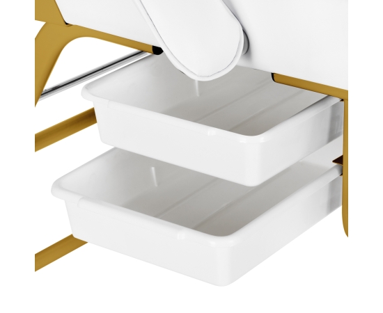 The 557G cosmetic chair with two trays is a practical piece of equipment that facilitates work in many specialized salons, including beauty, massage or tattoo parlours. It will be suitable for those who are looking for a simple, functional, yet distinctive piece of cosmetic furniture. Retractable containers mounted under the seat make the most important tools and preparations always at hand.