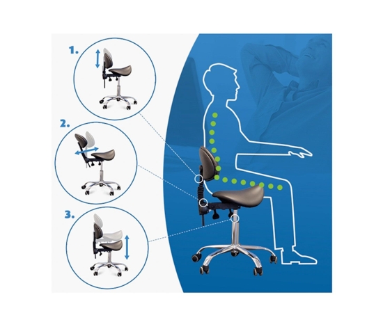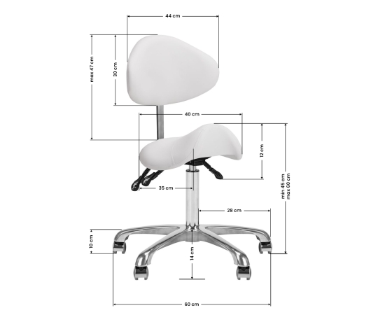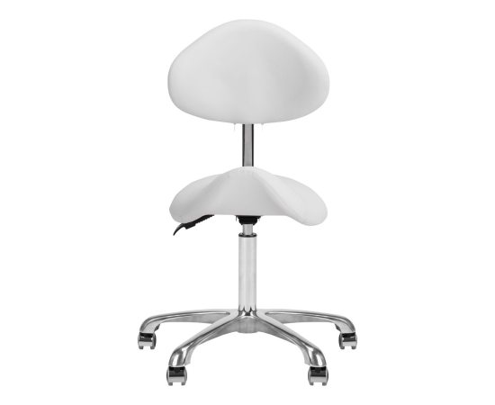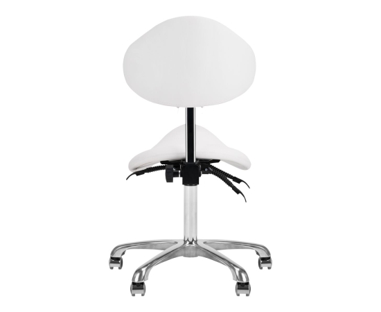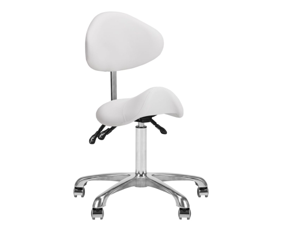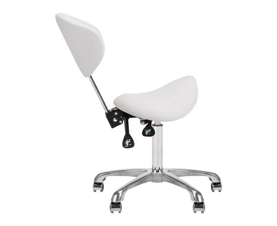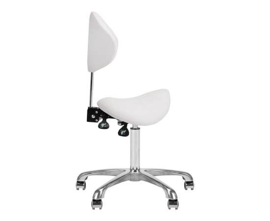Comfortable, exclusive, stable cosmetic stool with a backrest and a profiled seat, on a five-star, very stable base. Adjustable in three planes: