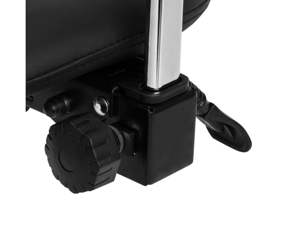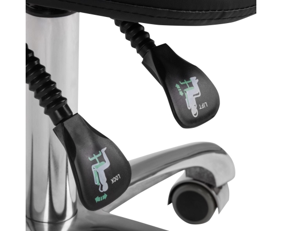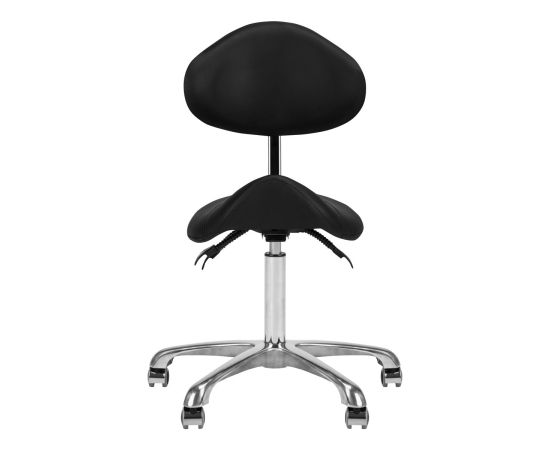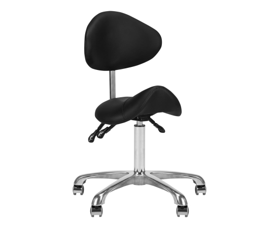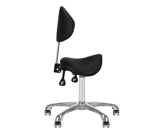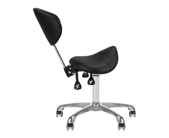 Comfortable, exclusive, stable cosmetic stool with a backrest and a profiled seat, on a five-star, very stable base. Adjustable in three planes: