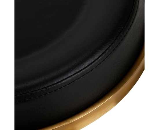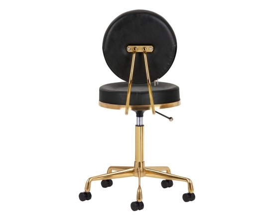 This black and gold stool has a comfortable seat and a backrest covered with ecological leather. It is located on a stable five-star base. Made of metal parts, it is durable and resistant to damage. The seat height is efficiently regulated. Plastic wheels allow you to easily change the position. The seat is fully rotatable.