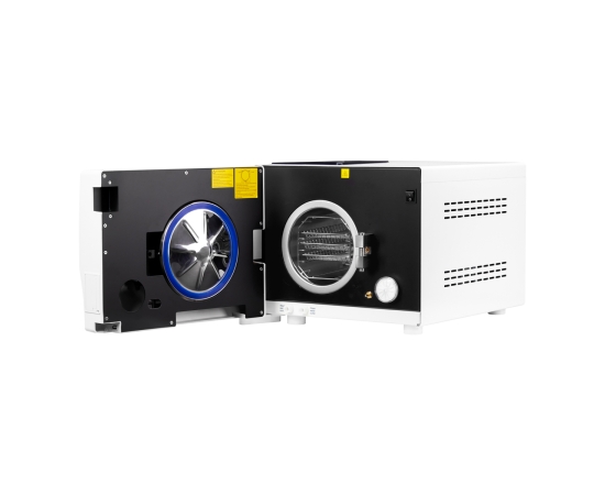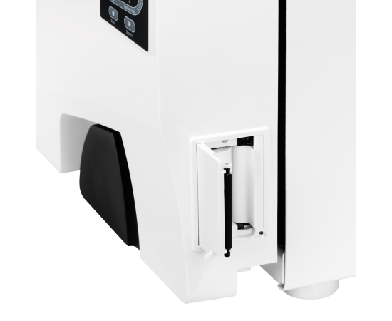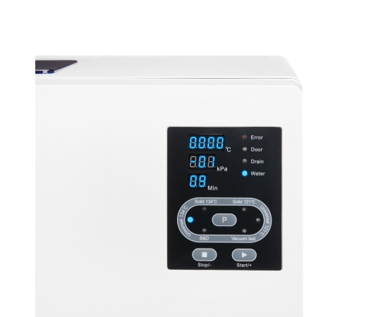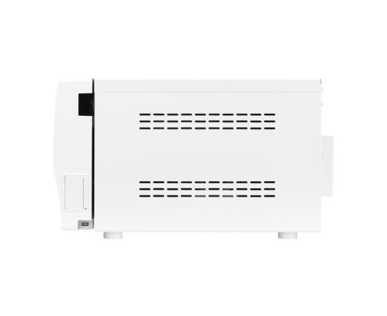 It is a compact device that combines the 8 liter autoclave with a built-in thermal printer. It has LED display and USB port, which allows you to connect a flash drive to save the results of the cycle. It has 6 fully automatic programs; 4 sterilization programs and 2 test programs. The shortest sterilization program takes only 8 minutes including drying. The device has a built-in tank for clean (distilled) water for sterilization, and a tank for used water with the possibility of drainage at the front of the device. Self-diagnosis system will effectively protect against damage and preserve the durability of the device. Additional security is provided by the double door lock system.