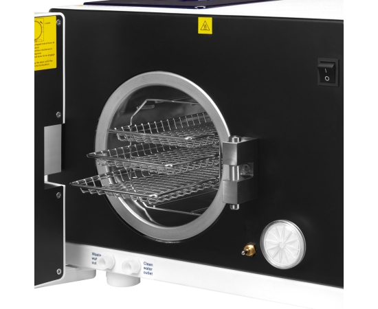 Built-in tanks for clean and used water The clean water tank is designed for distilled or deionized water that will be used for sterilization. The presence of a used water tank means that we do not need to remember about an external container. The used (and clean) water drain is on the front of the machine.