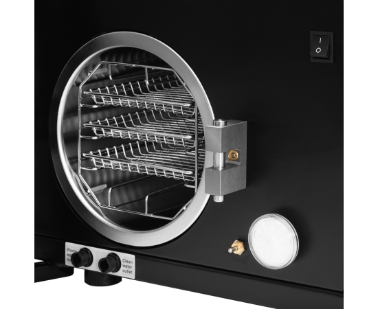 | Built-in tanks for clean and used water | The clean water tank is intended for distilled or deionized water for sterilization. The presence of a used water tank means that we do not need to remember about an external container. The used (and clean) water drain is on the front of the machine. |