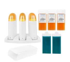 depilation kit "valencia" the kit includes: - trio wax heater - depilatory wax with a wide roll 2 pcs - depilatory wax with a narrow roll 3 pcs - epilation strips 100 pcs - foil gloves 100 pcs  device for heating 3 wax depilatory cartridges. each wax...