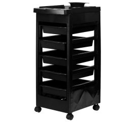 black hairdressing assistant with 2 lockable key shutters, 4 litter boxes and 15 compartments for hairdressing assortment. stable construction will ensure long-term use. table mounted on wheels, thanks to which the tools will always be at hand.  helper with parts for...