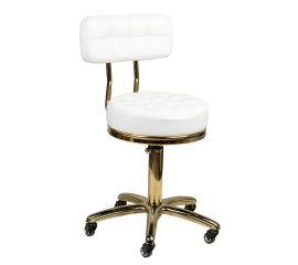 Unique white cosmetic stool with a quilted seat and comfortable backrest. metal elements sparkle with golden color. it is height-adjustable and the arm-like base is equipped with solid metal-rubber wheels. Gold elements are coated with lacquer. Mechanical damage to the coating is not subject...