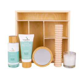 Női ajándék szett, Zuhanyolaj, kézkrém, masszírozó fa, illatosított gyertya, Bath set HOME SPA in wooden storage box, 100ml bath oil, 60ml hand & body lotion, fragrance candle, mirror, wooden massager, fragrance: Lotus & Jojoba, col. mint green/brown/white Add ajándékba ezt az ideális női...
