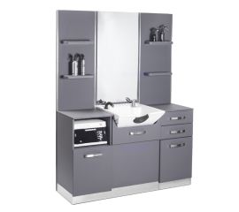 modern hairdressing console in gray with silver trim. a large mirror, sink and drawers ensure functionality, and the entire piece of furniture is finished with the highest quality. it is an elegant and at the same time universal element of the interior that will emphasize the character of any...