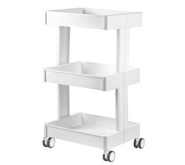 functional plastic table on rubber wheels. the table has three shelves with a rail to prevent the contents from falling out.  package dimensions 49 * 37 * 25