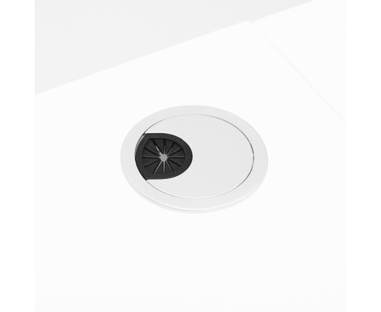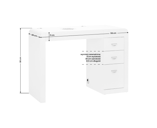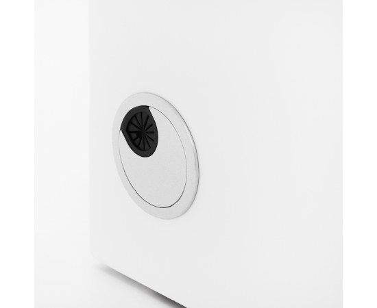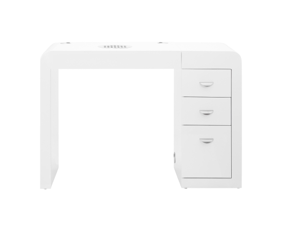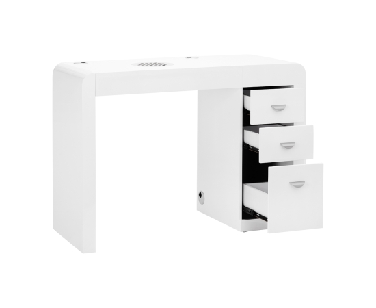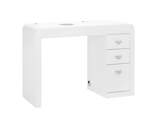 Three spacious drawers make it easier to organize and keep the most necessary cosmetics and tools in order. The desk is equipped with a practical absorber that effectively reduces the amount of harmful dust, providing clean and fresh air in the workplace. At the same time, thanks to its integration into the tabletop, it does not take up valuable work space. Specially designed places for cables make it easier to organize necessary devices in the salon, such as nail drill machines, treatment lamps or nail lamps, allowing you to hide the cables.